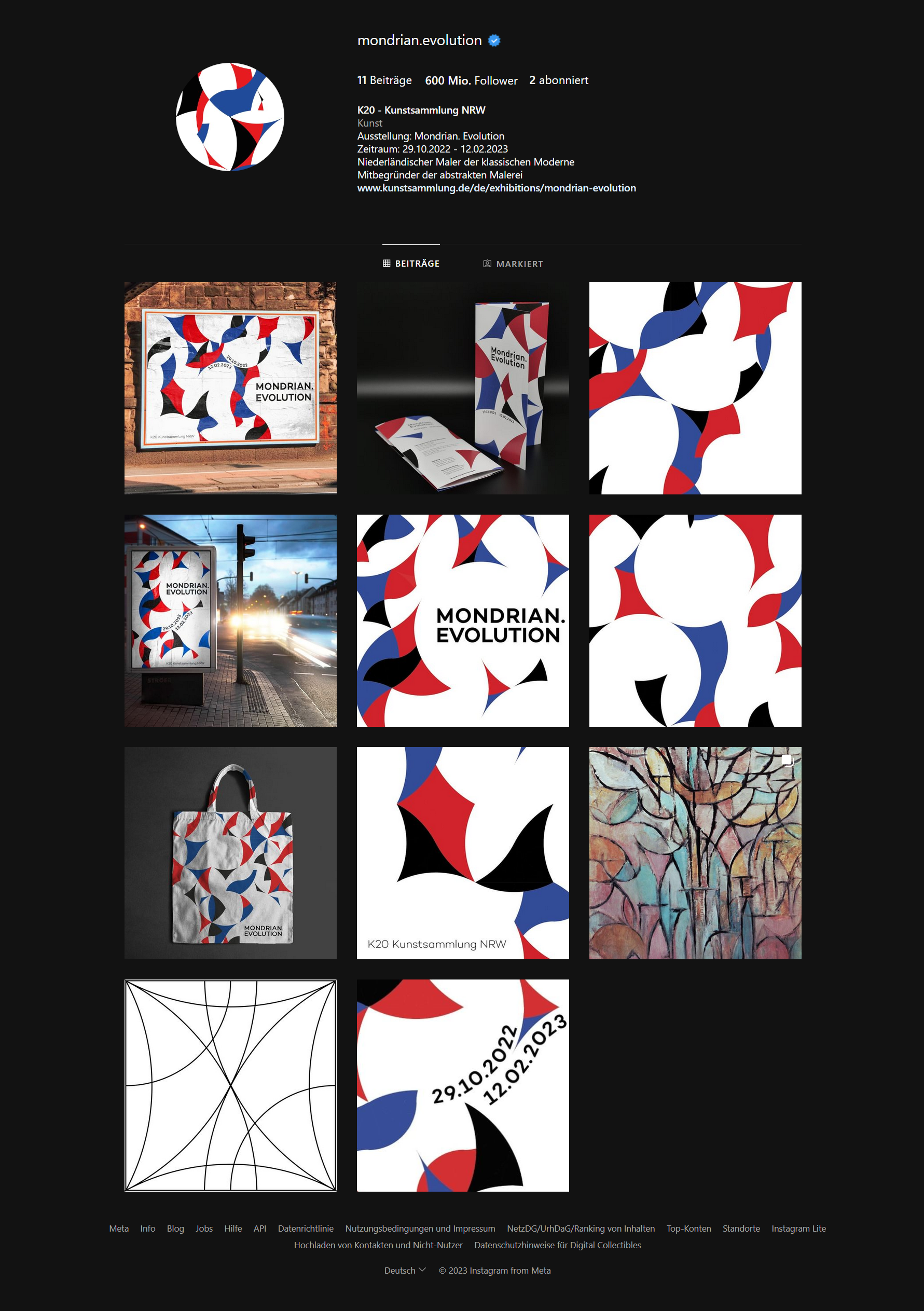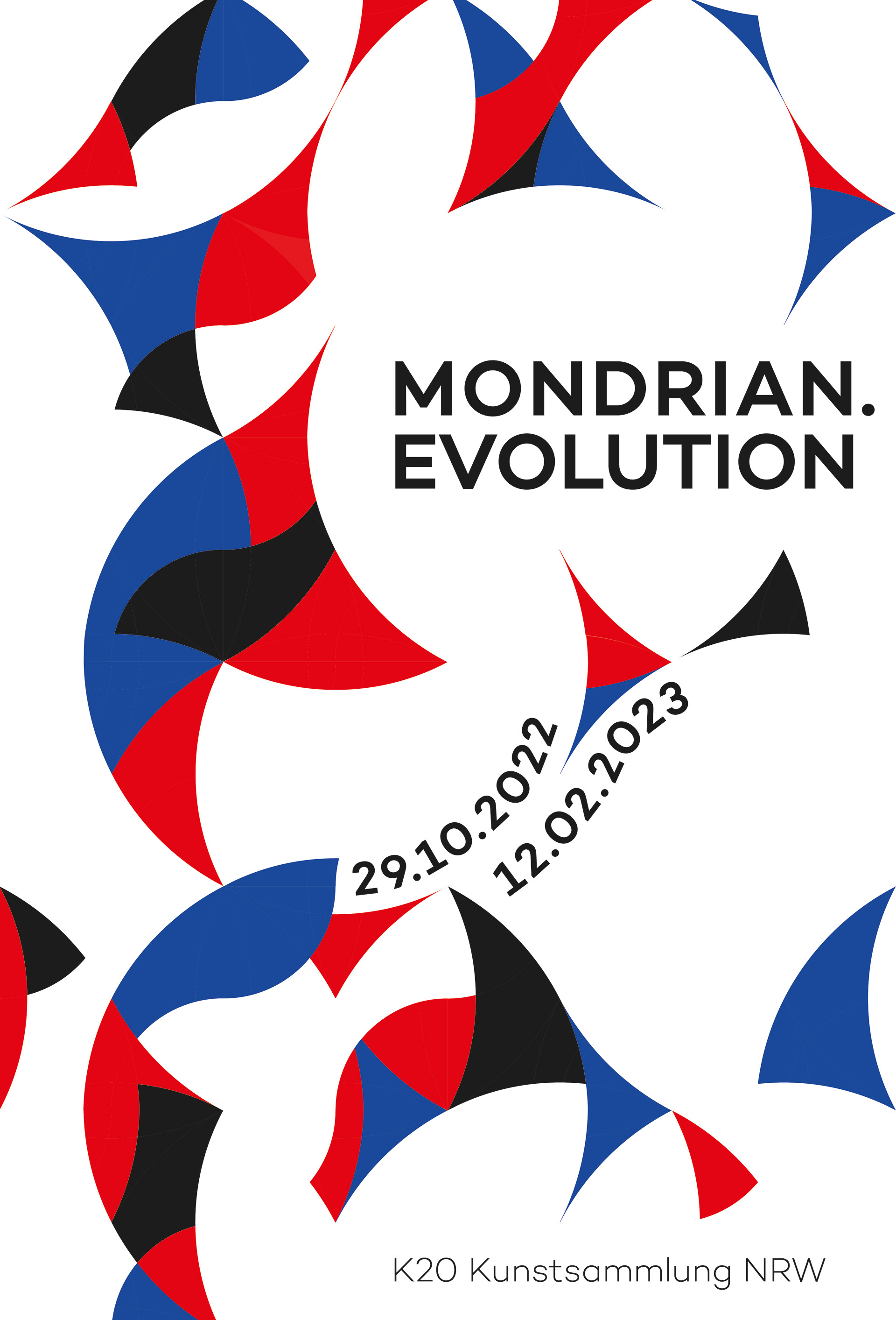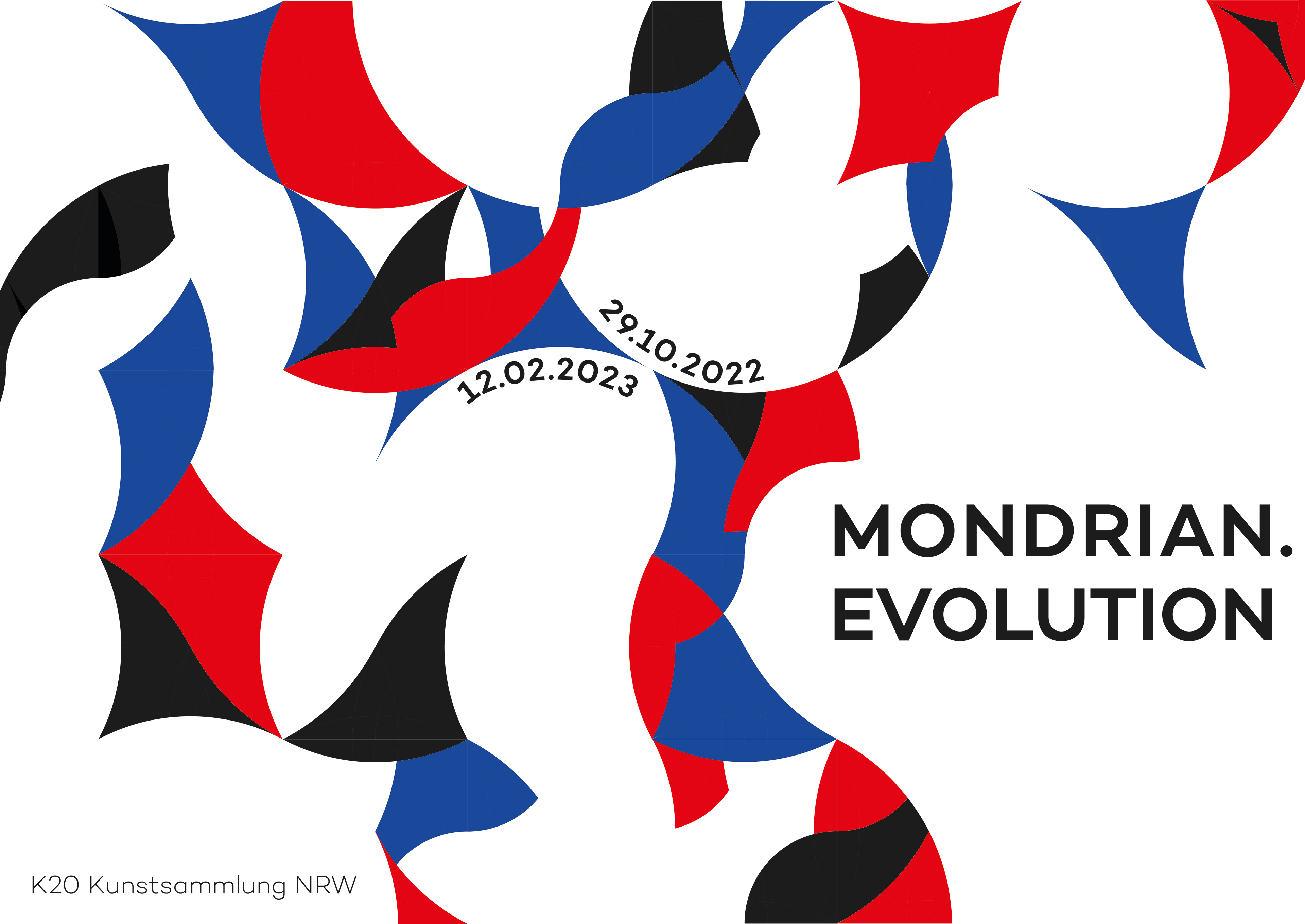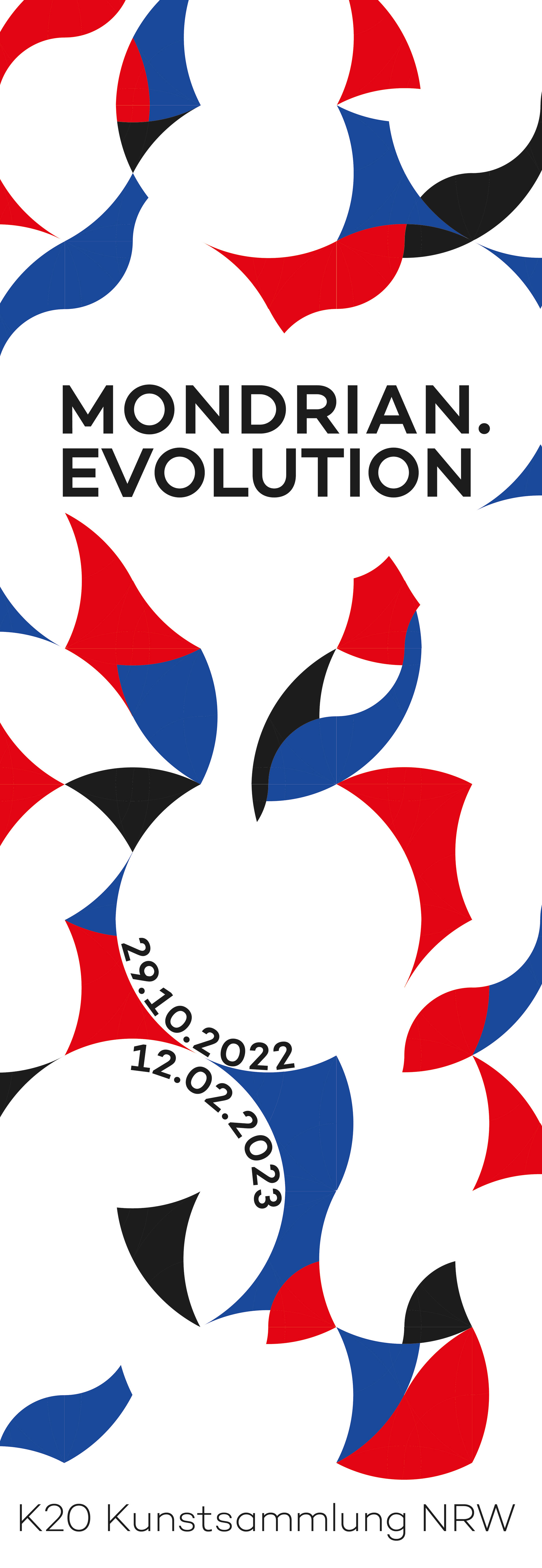 Corporate Design für die fiktive Ausstellung „Mondrian Evolution" in der K20 Kunstsammlung NRW. Das Kampagnendesign interpretiert Mondrians ikonische geometrische Kompositionen neu und übersetzt sie in ein modernes visuelles System.